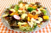 Numa saladeira ou em um prato de sua escolha, monte a salada como preferir, ou siga esta sugestão: alface americana, endívia, radicchio, rúcula, cenoura ralada, repolho roxo e o branco, broto de trevo ou a alfafa, tomate seco, mussarela de búfala, kani, uvas passas, castanha do Pará, batata palha, manga, kiwi e tempere com o molho de mostarda ou outro molho de sua preferência